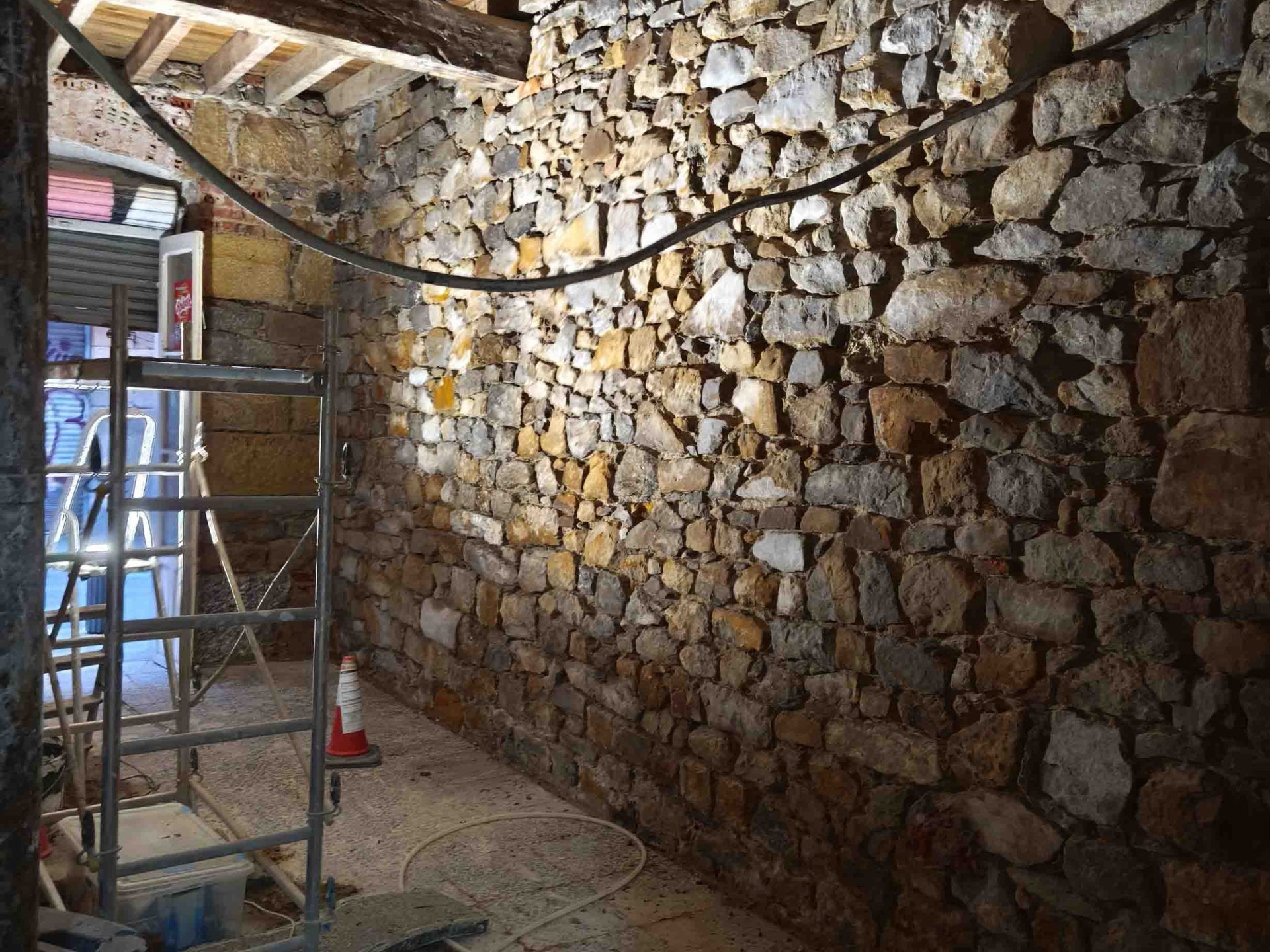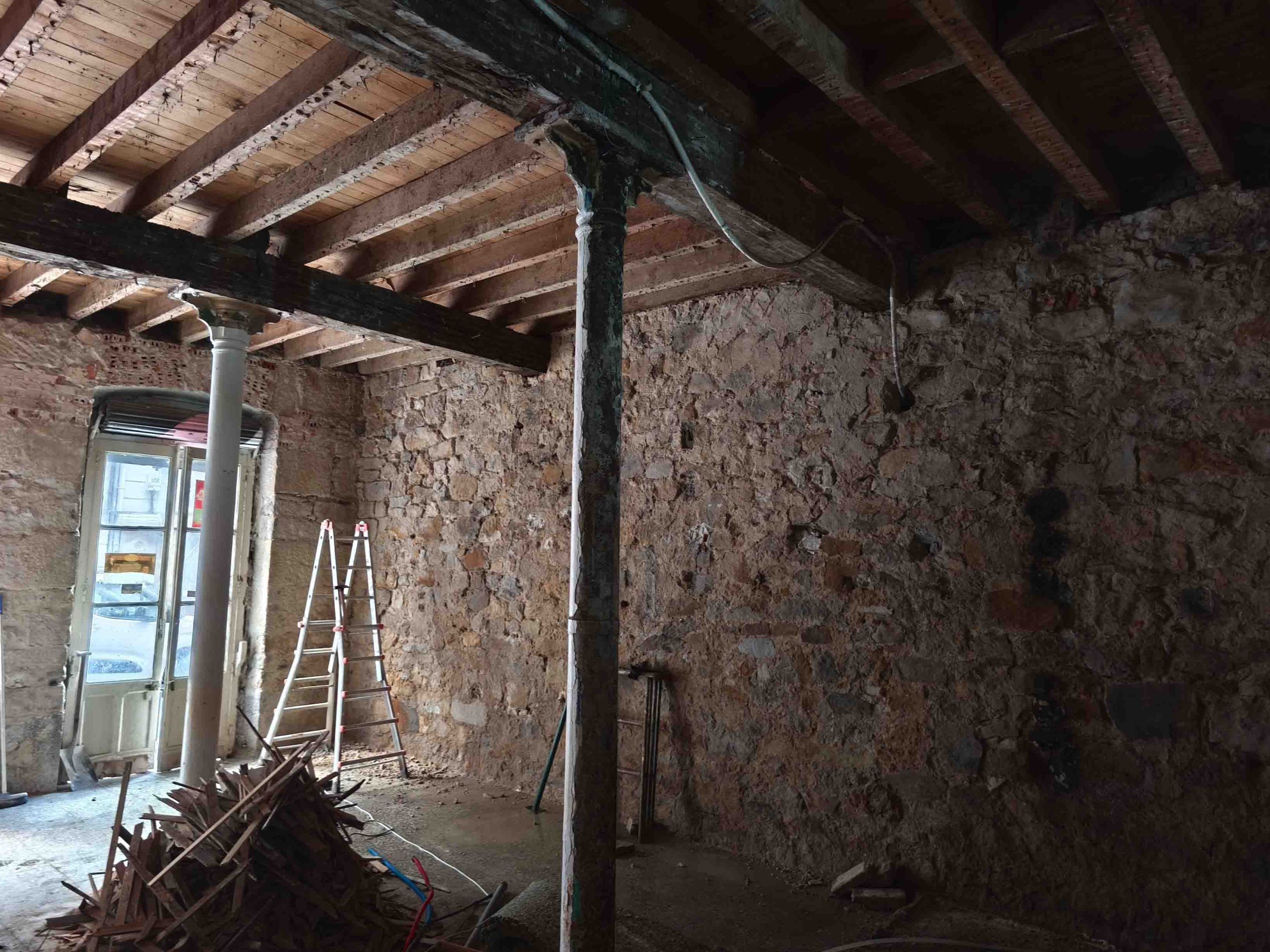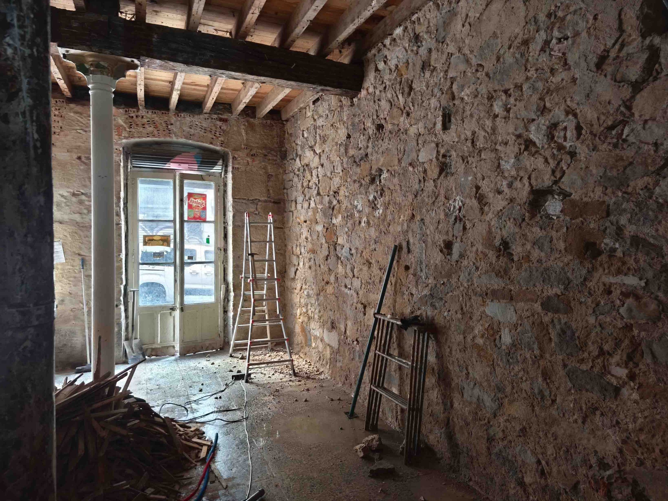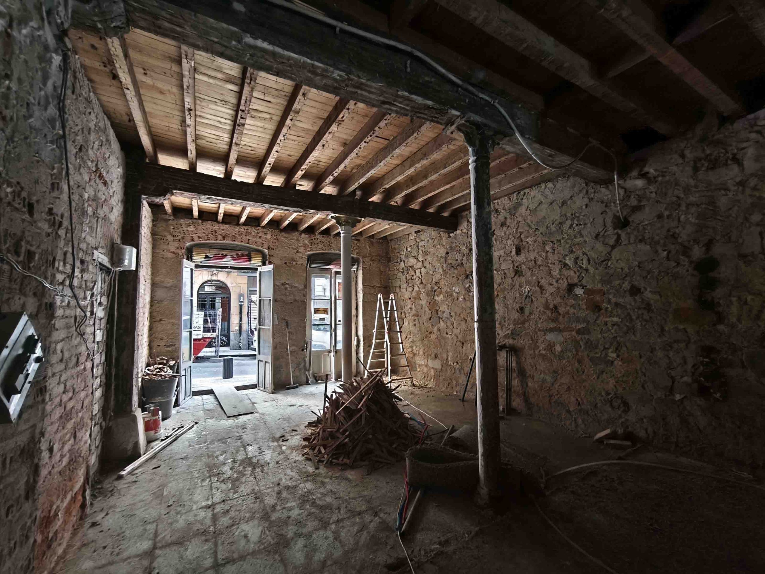 Adecuación integral de local comercial con intervención en fachada y estructura interior. Se ha realizado el desescombro, saneado de muros de piedra y ladrillo original, y preparación del espacio para una nueva distribución.