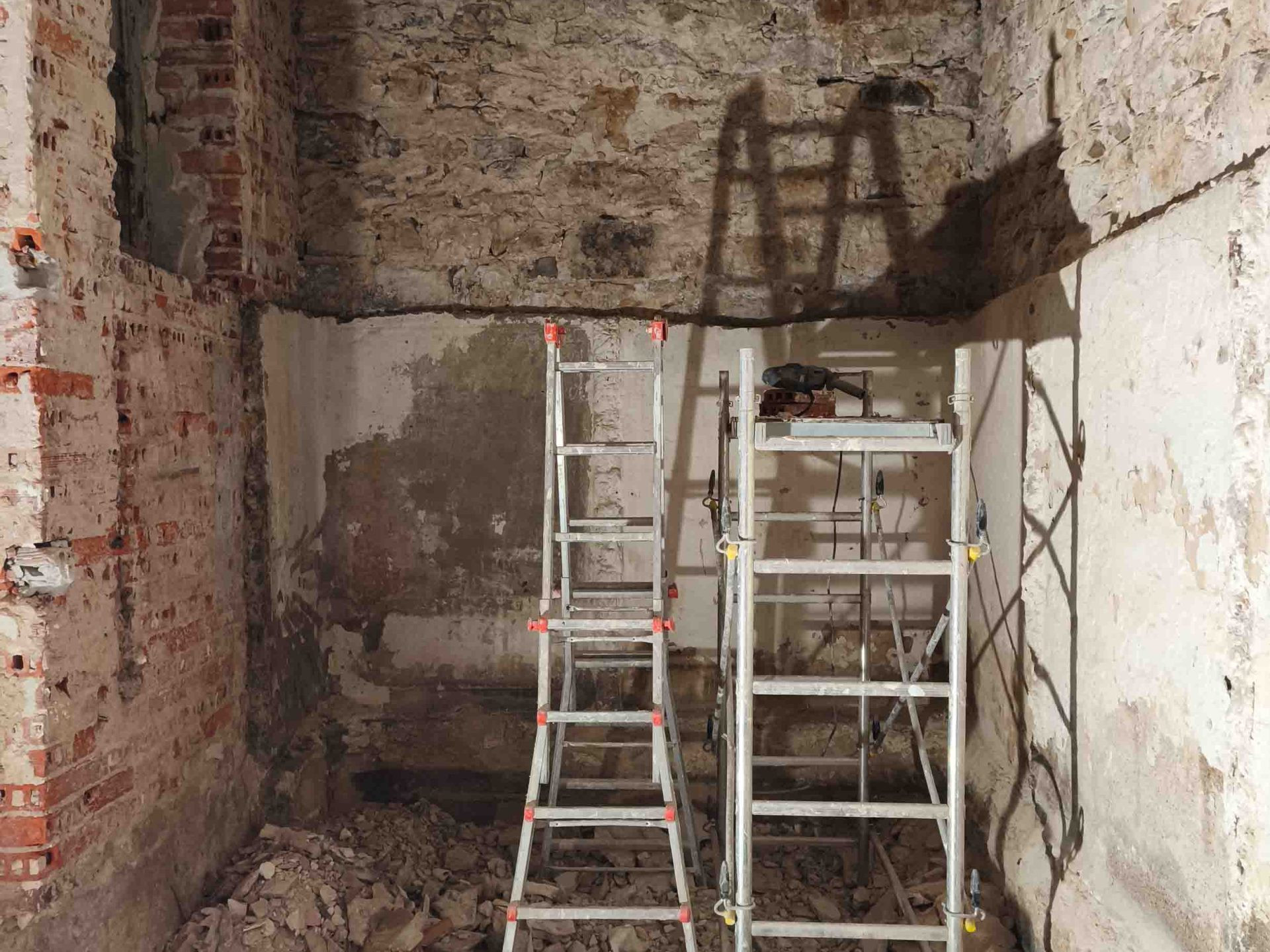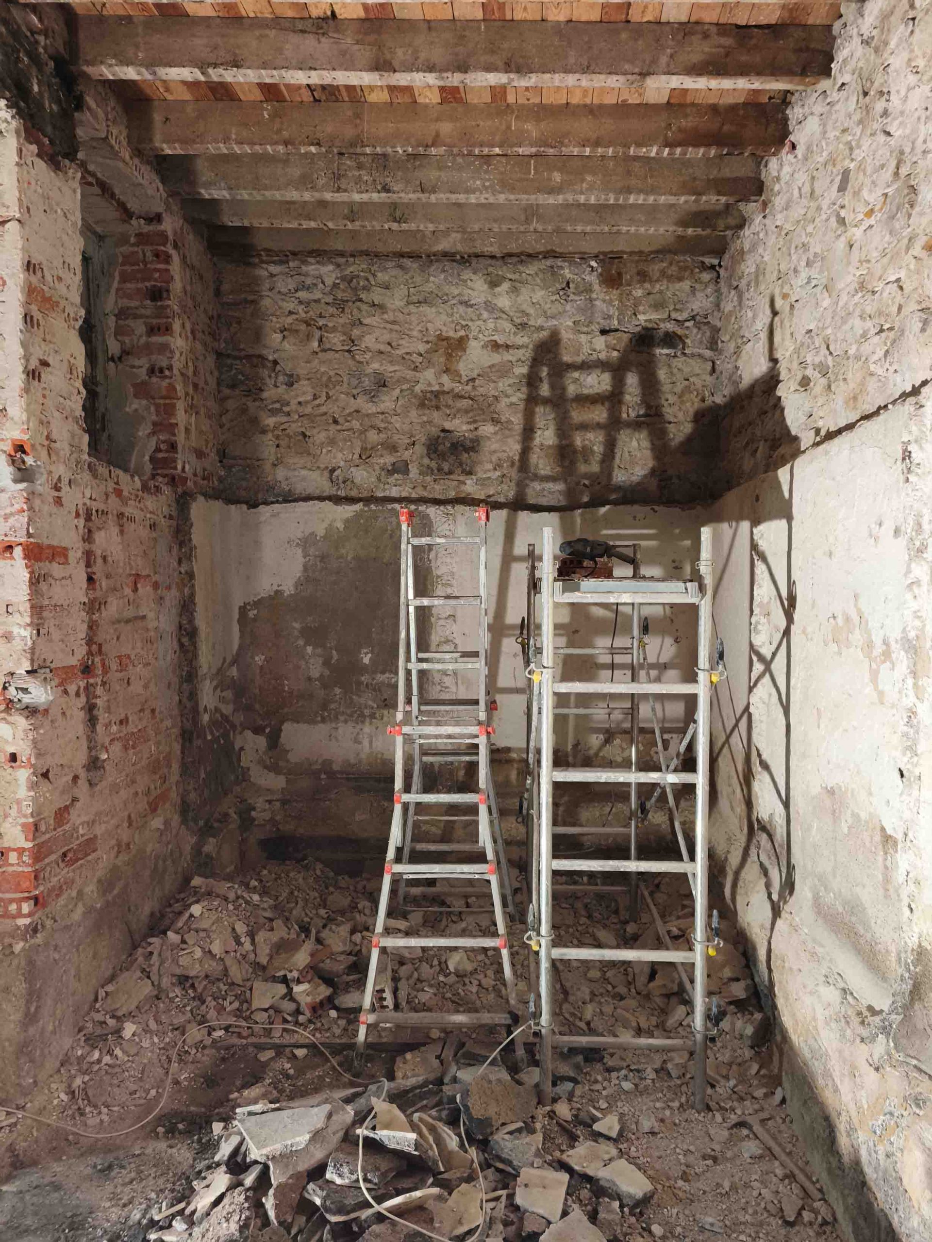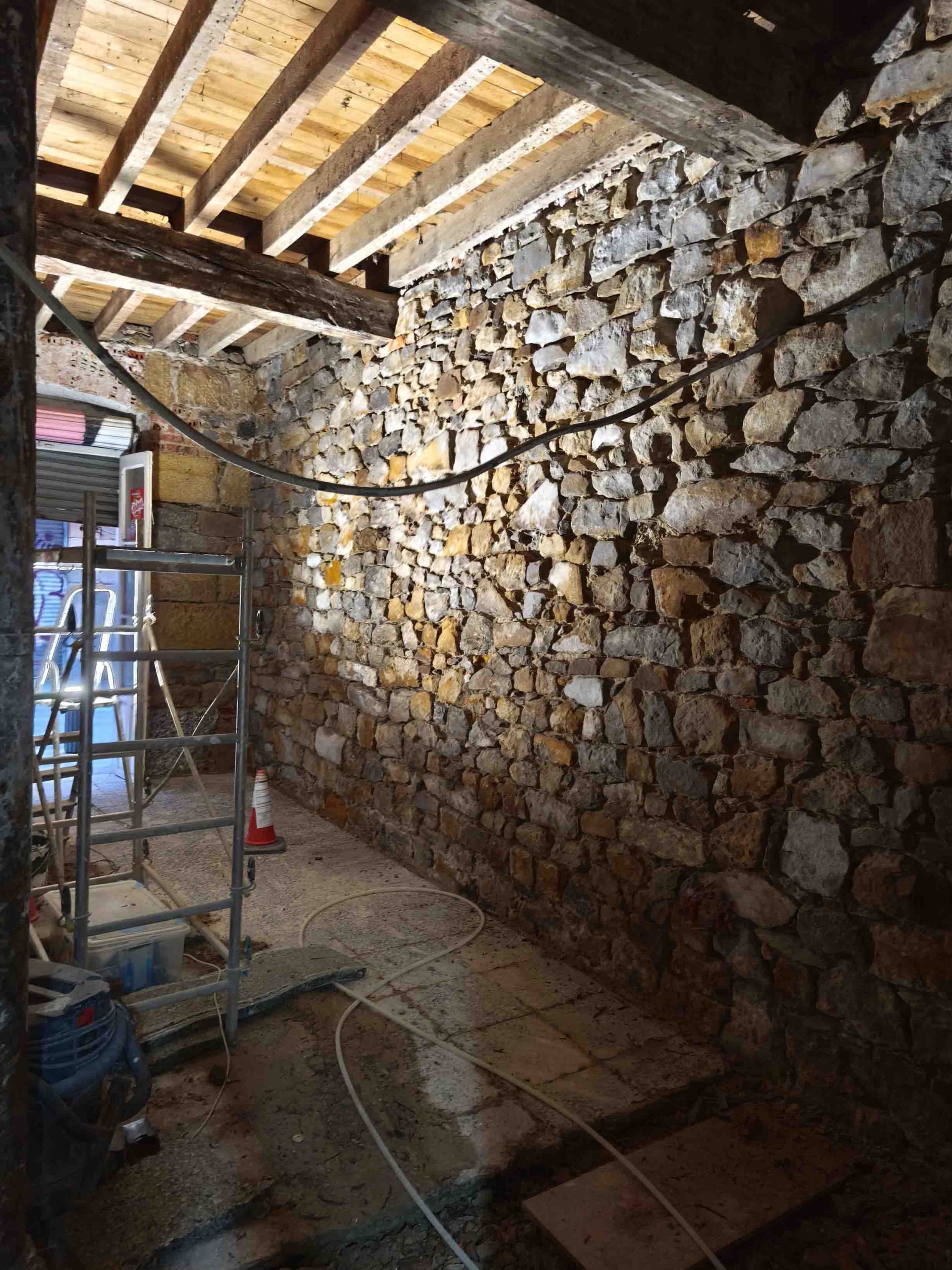 Adecuación integral de local comercial con intervención en fachada y estructura interior. Se ha realizado el desescombro, saneado de muros de piedra y ladrillo original, y preparación del espacio para una nueva distribución.